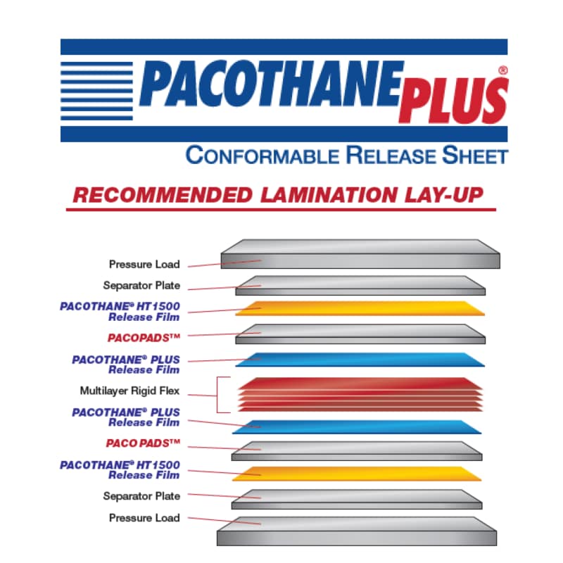 A conformable release film that is specifically engineered for use as a component of the Pacothane Plus System for the production of Flexible Printed Circuits (base stock, coverlay, and rigid-flex). Pacothane® Plus brings standardization and predictability to the flex laminating process and offers tangible process advantages.