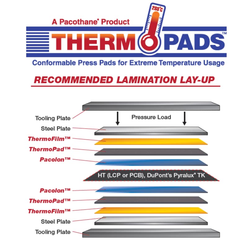 Designed to be integrated into the lamination systems of High Speed Circuits in particular HDI Flexible Circuits that require functional performance under high temperatures and still offer a degree of Macro Z-Axis pressure distribution (conformability), that is not available from make shift alternatives or the typical harder base polymers offered in typical high temperature press pads.